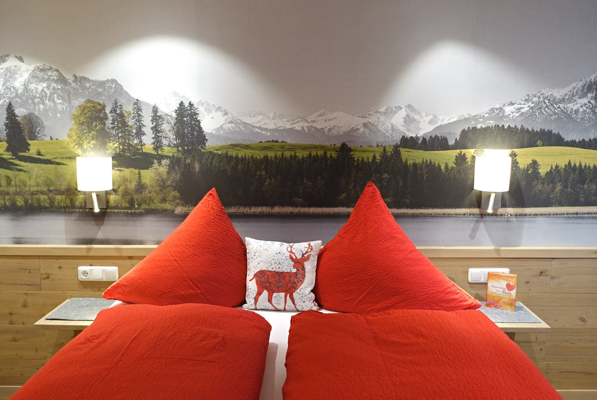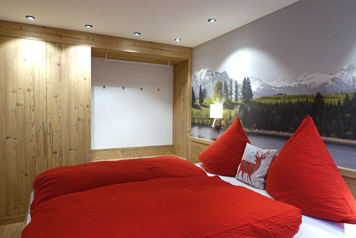 Zwei Schlafzimmer im modernen Altholz-Look bieten erholsamen Schlaf. Massivholz-Doppelbetten, Einbauschränke und liebevolle Allgäuer Details schaffen eine ruhige Atmosphäre. Eine zusätzliche Schlafcouch bietet Platz für eine weitere Person.