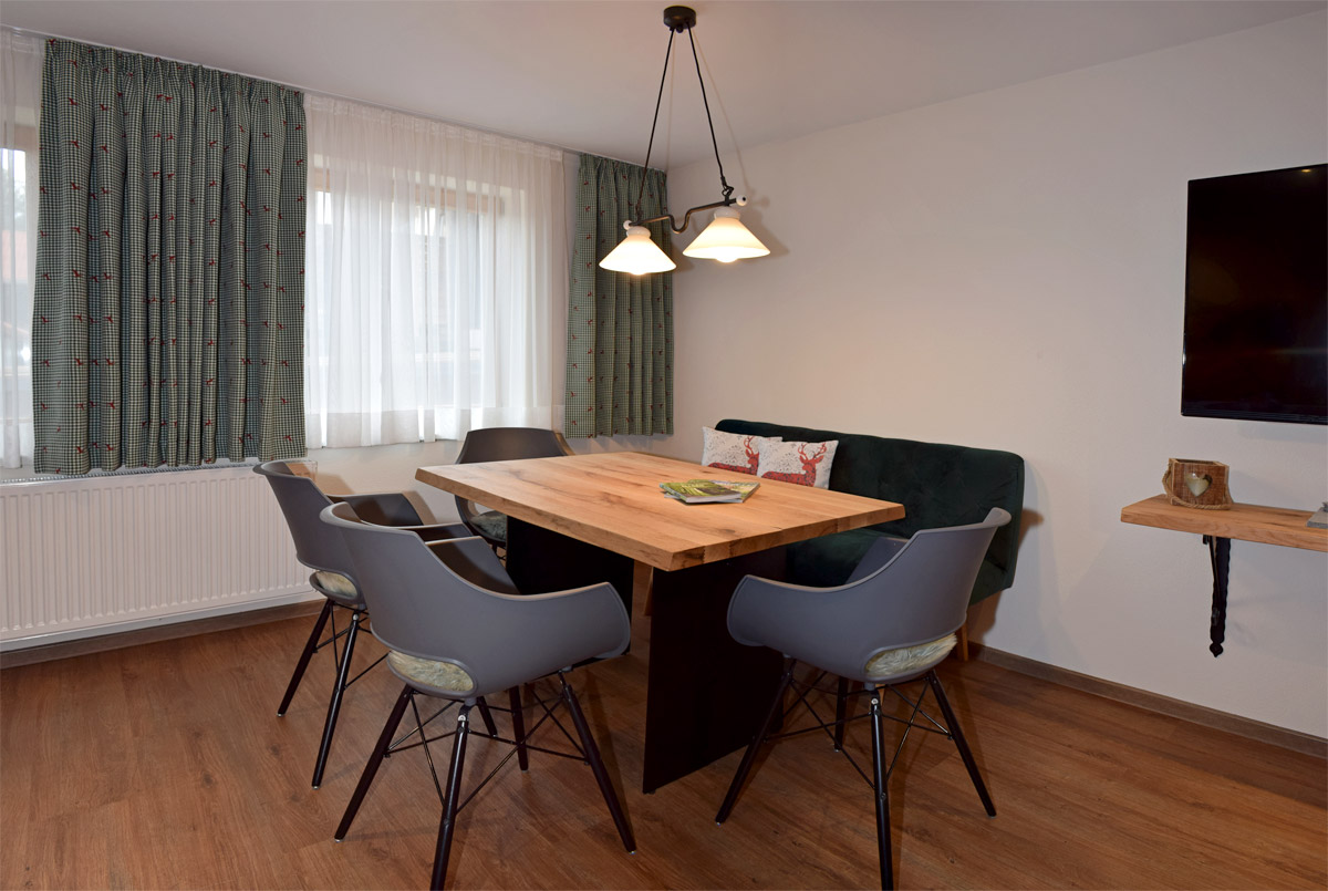 Der großzügige Wohnbereich verbindet Allgäuer Charme mit modernen Akzenten. Die gemütliche Kuschelcouch und der großzügige Wohnraum bieten viel Platz für gemeinsame Abende, Spiele und entspannte Stunden. Ein 55“-Flachbildschirm mit SAT-TV sowie WLAN runden den Komfort ab.