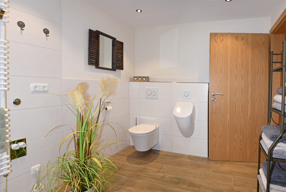 Großzügiges Bad mit Badewanne, begehbarer Dusche, Waschtisch, beleuchtetem Spiegel, WC, Pissoir, Fußbodenheizung und Handtuchheizkörper -