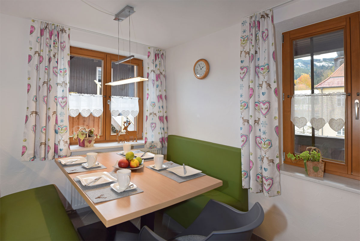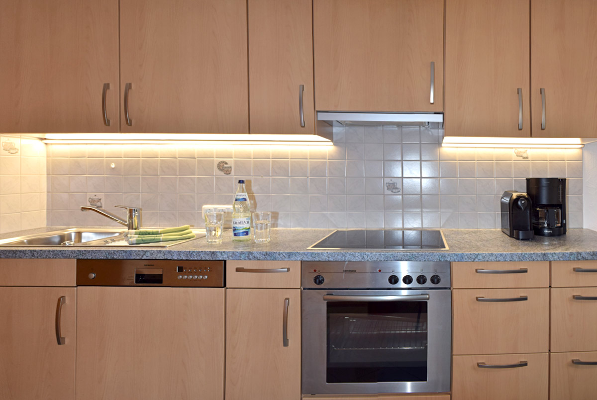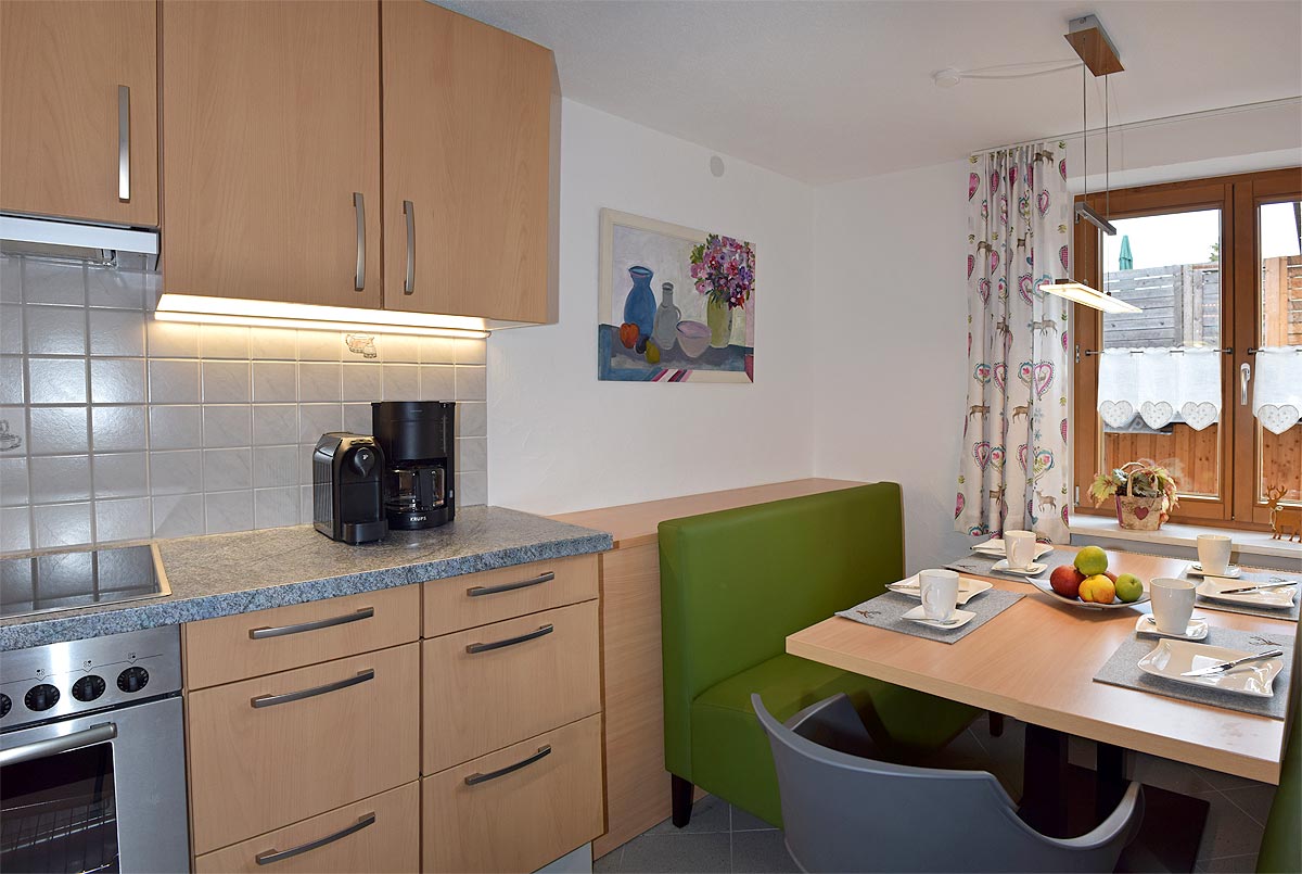 Die offen gestaltete Küche ist vollständig ausgestattet – mit Cerankochfeld, Backofen, Geschirrspüler, Kühlschrank mit Gefrierfach sowie Kaffee- und Espressomaschine. Der gemütliche Essbereich lädt zu gemeinsamen Mahlzeiten ein.