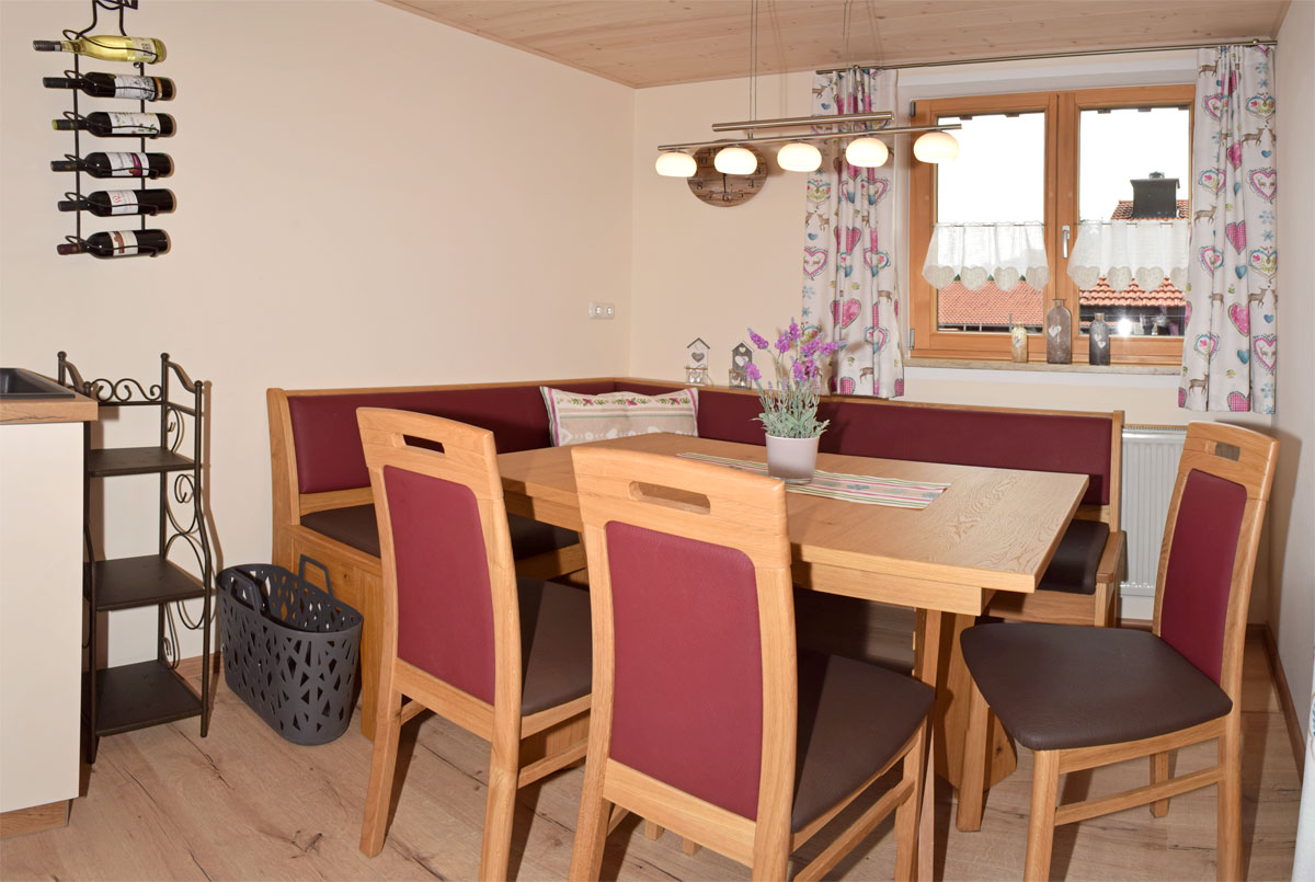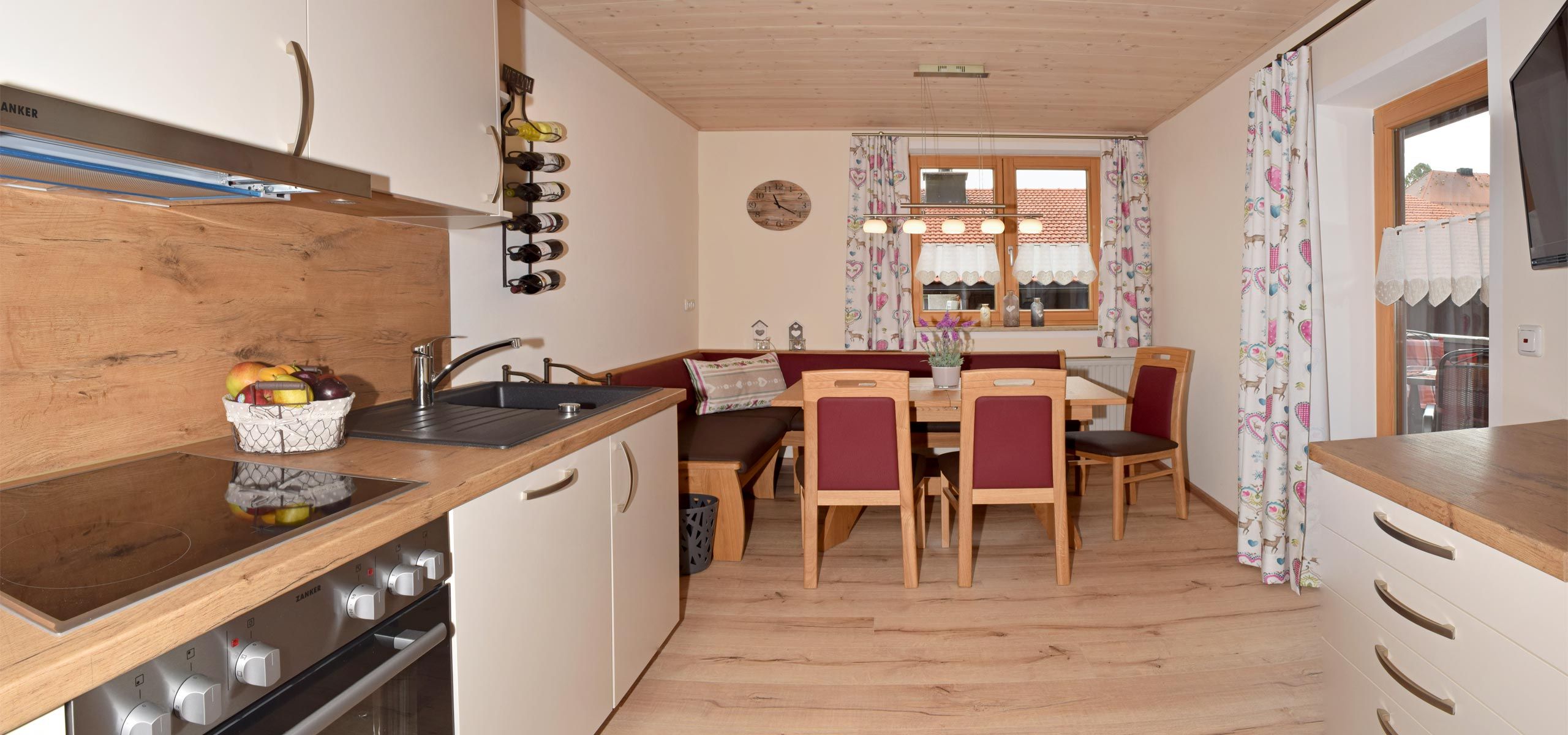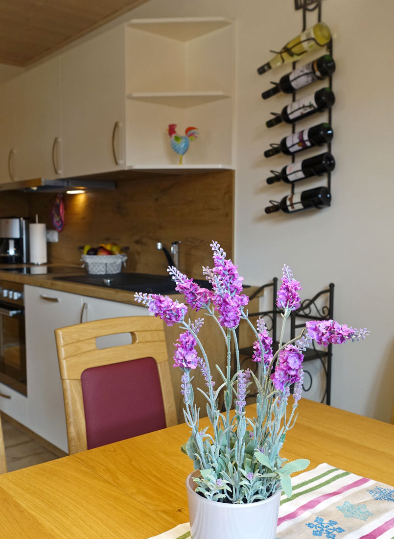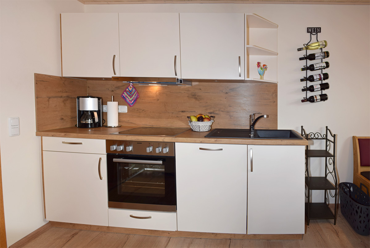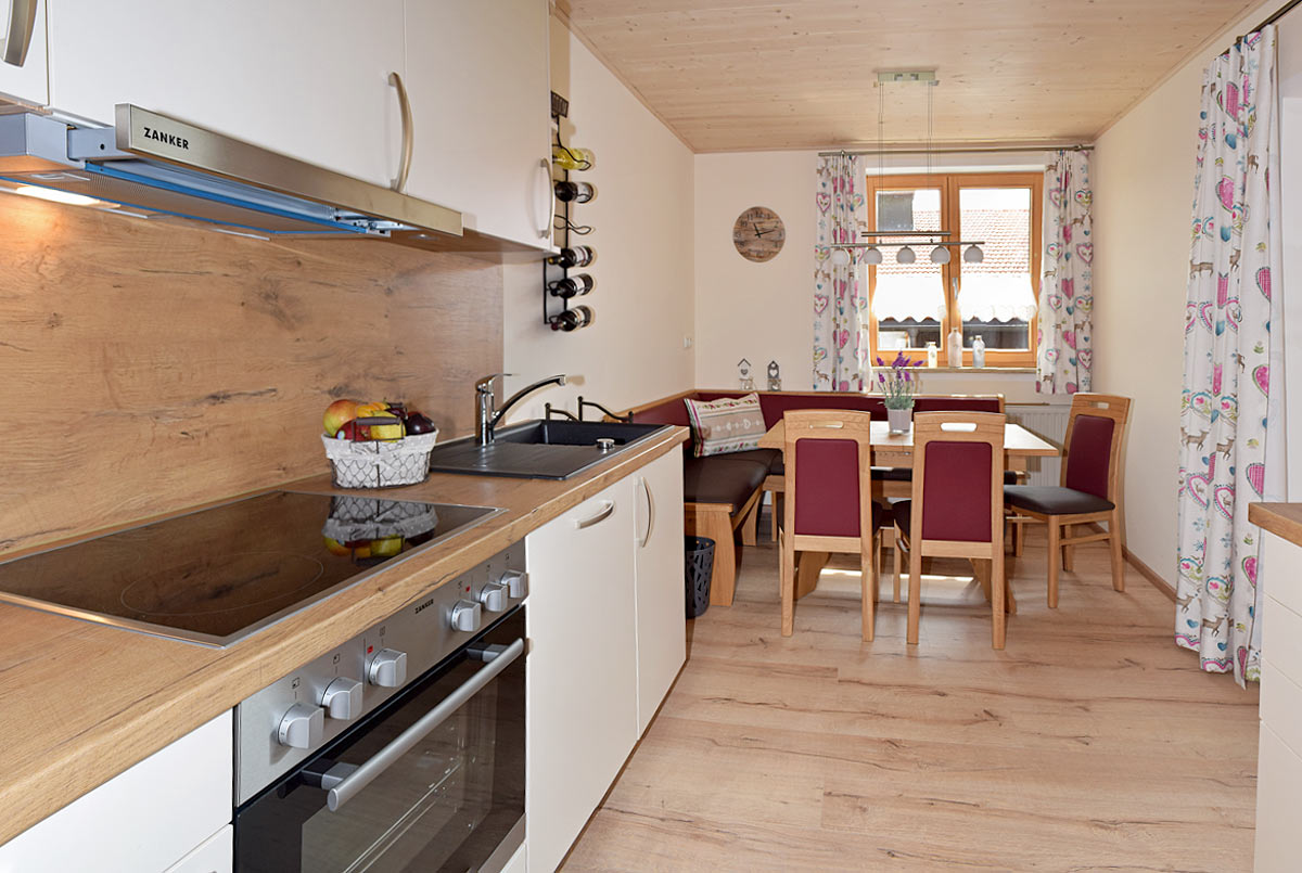 Die offen gestaltete Wohnküche ist vollständig ausgestattet mit Cerankochfeld und Backofen, Geschirrspülmaschine, Kühlschrank mit Gefrierfach sowie Kaffee- und Espressomaschine. Eine gemütliche Essecke für sechs Personen lädt zu gemeinsamen Mahlzeiten ein, von hier gelangen Sie direkt auf den Südbalkon.