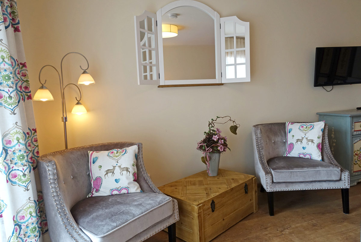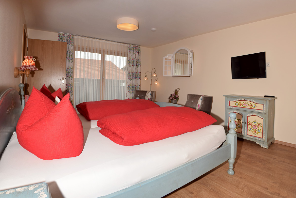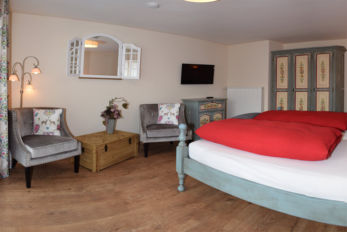 1. Schlafzimmer mit Doppelbett, Bauernschrank, Sofa, Fernseher mit SAT/TV sowie Waschbecken -