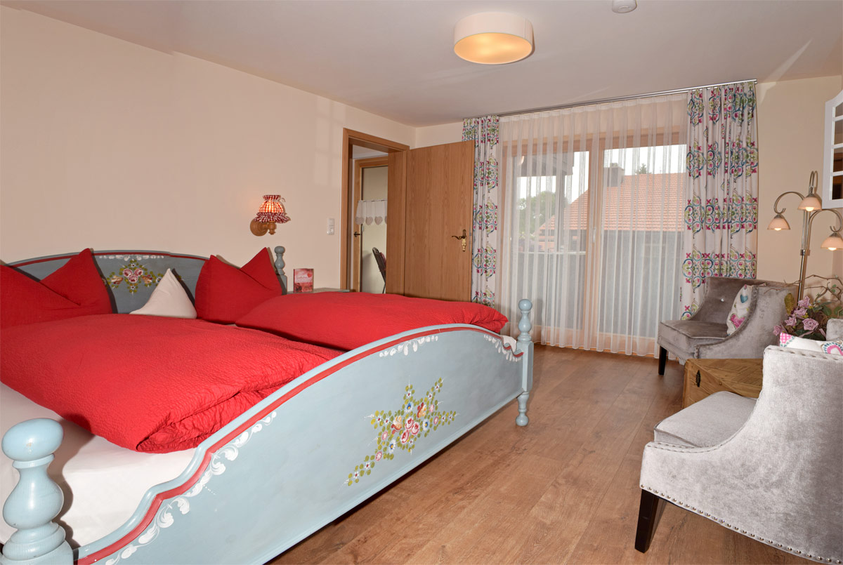 Die 4-Raum-Ferienwohnung Vogelnest liegt im 2. Stock unseres Bauernhauses und bietet mit 90 m² großzügigen Platz für bis zu 6 Personen. Natürliche Allgäuer Materialien, modern kombiniert mit Tradition, verleihen der Wohnung ihren besonderen Charme – trotz Nähe zur Straße ist es nachts angenehm ruhig.
