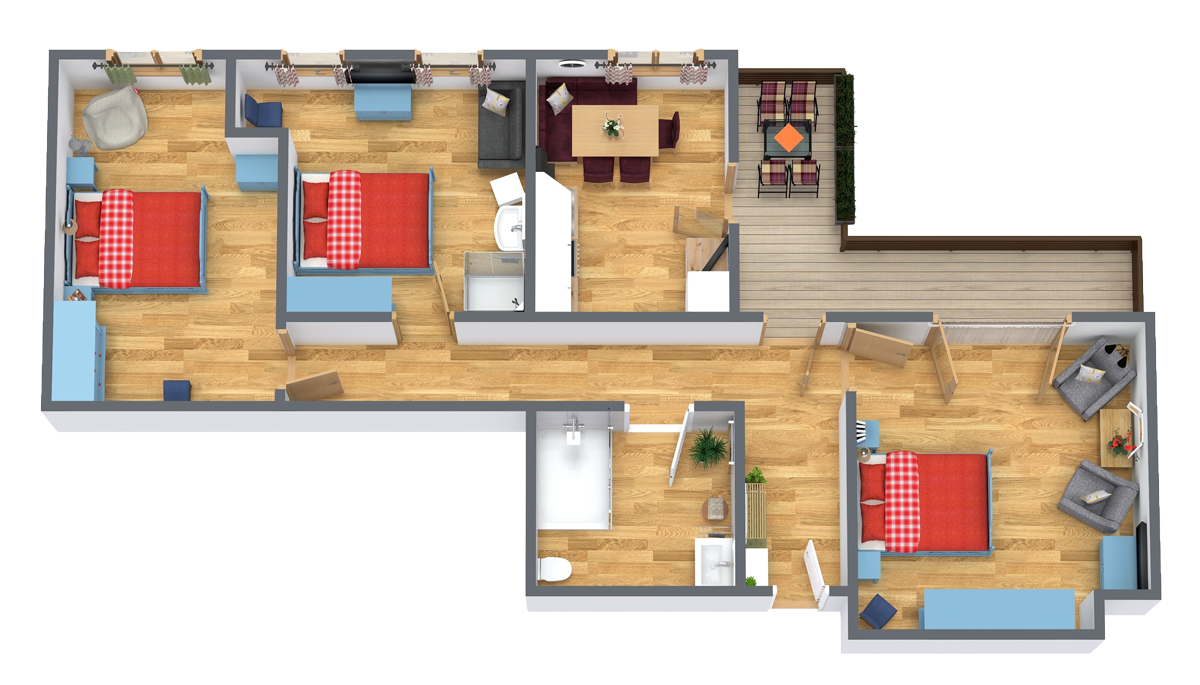 Drei separate Schlafzimmer mit Doppelbetten bieten viel Platz und Rückzugsmöglichkeiten. Ein Schlafzimmer verfügt zusätzlich über ein Waschbecken, ein weiteres eignet sich besonders gut als Kinderzimmer, das dritte überzeugt mit direktem Zugang zum Balkon.